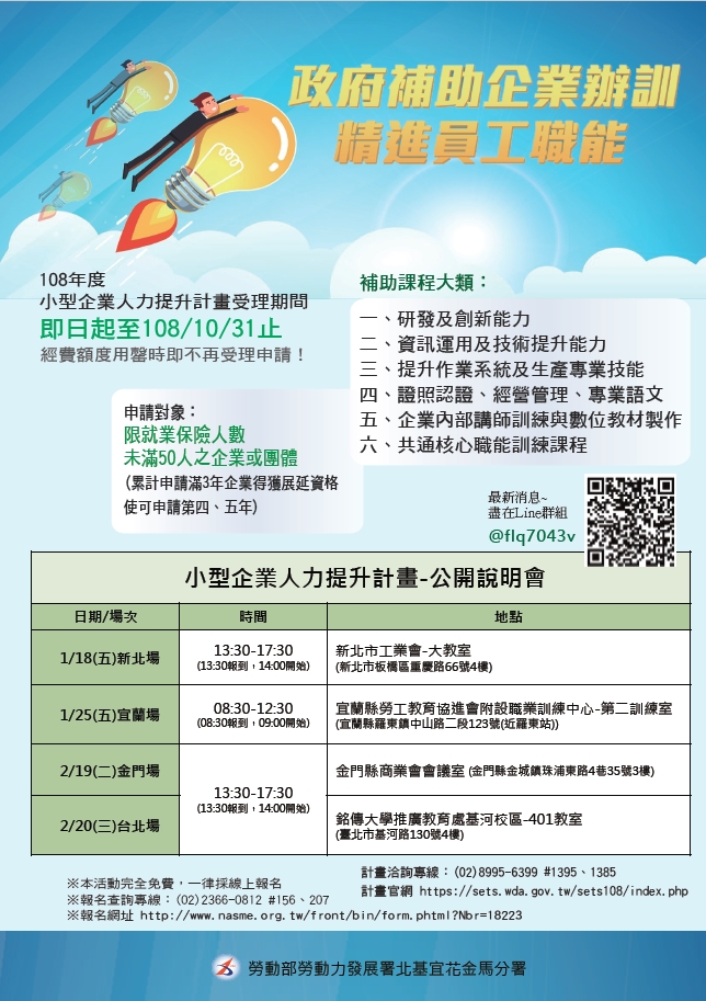 - 公會訊息2019-01-10 勞動部提倡企業教育訓練,藉由『小型企業人力提升計畫』之協助,邁開企業辦訓的腳步,持續培育人才讓企業永續,訂於108年2月19日(二)13:30-17:30假金門縣商業會舉辦教育訓練計畫說明會,歡迎踴躍報名參加。