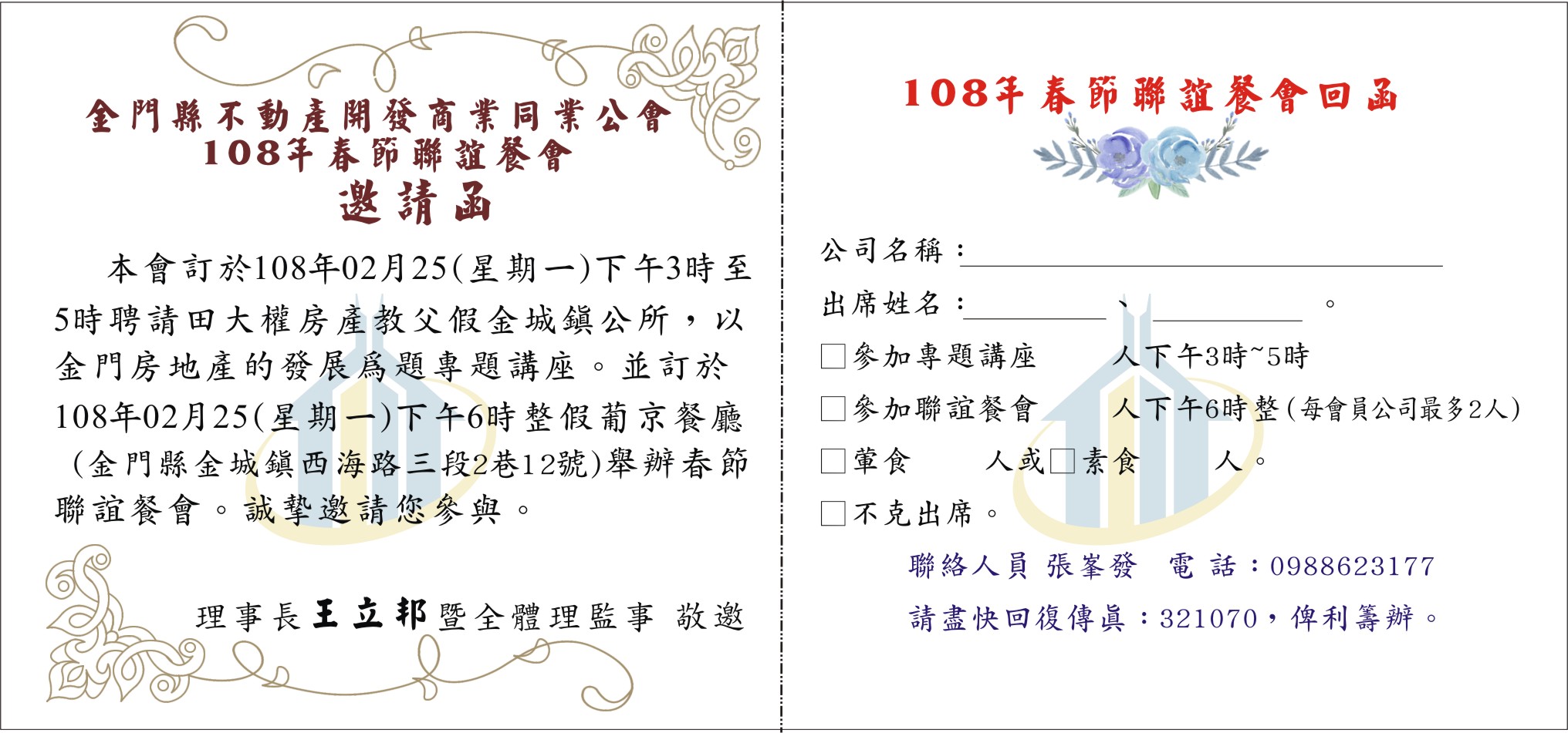 - 公會訊息2019-01-16 本會訂於108年2月25(星期一)下午3時至5時聘請田大權房產教父假金城鎮公所,以金門房地產的發展為題專題講座。並訂於108年2月25(星期一)下午6時整假葡京餐廳 (金門縣金城鎮西海路三段2巷12號)舉辦春節聯誼餐會。誠摯邀請您參與。回復單請於108年1月31日前回復,俾利安排,謝謝。
